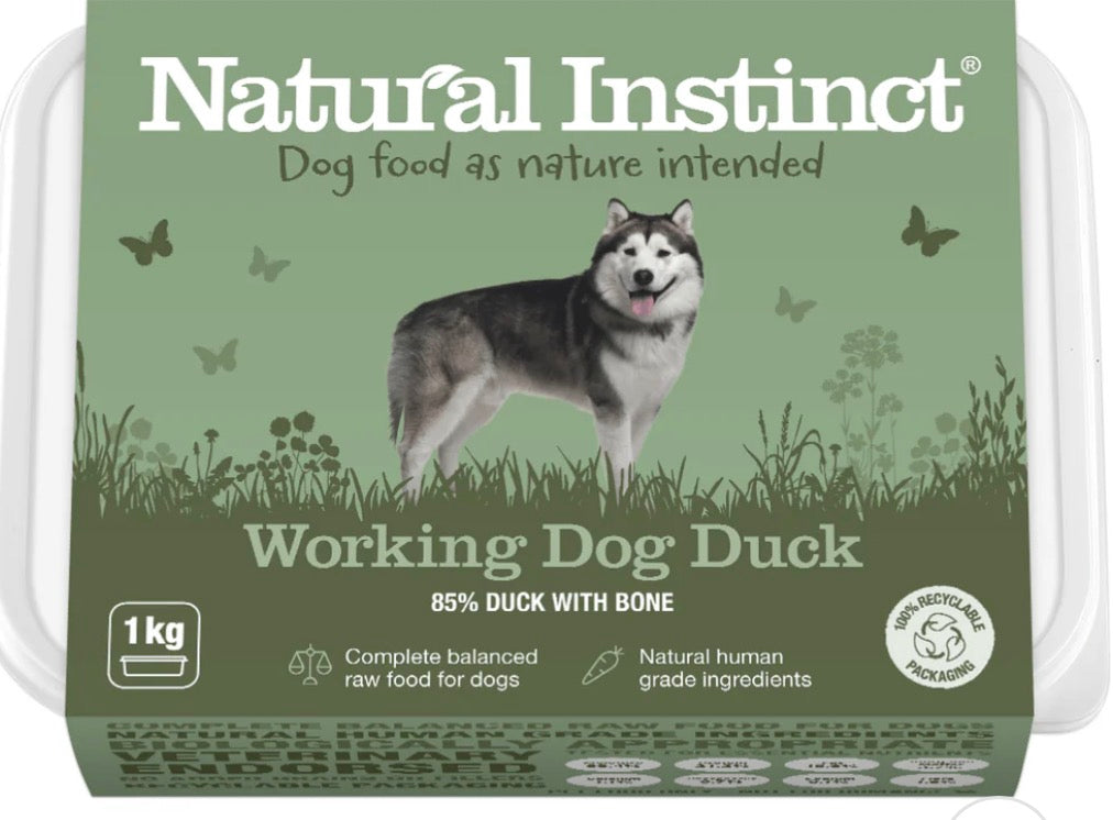 Natural Instinct's Working Dog Duck is a complete, balanced, raw dog food. This frozen feast uses human-grade duck meat with bone (85%), vegetables, fruits, and added Vitamin C. Naturally high in fat, our duck is a great weight-gain recipe, whilst the added Vitamin C helps support and maintain your working dog's immune system, ligaments and joints, keeping them healthy.