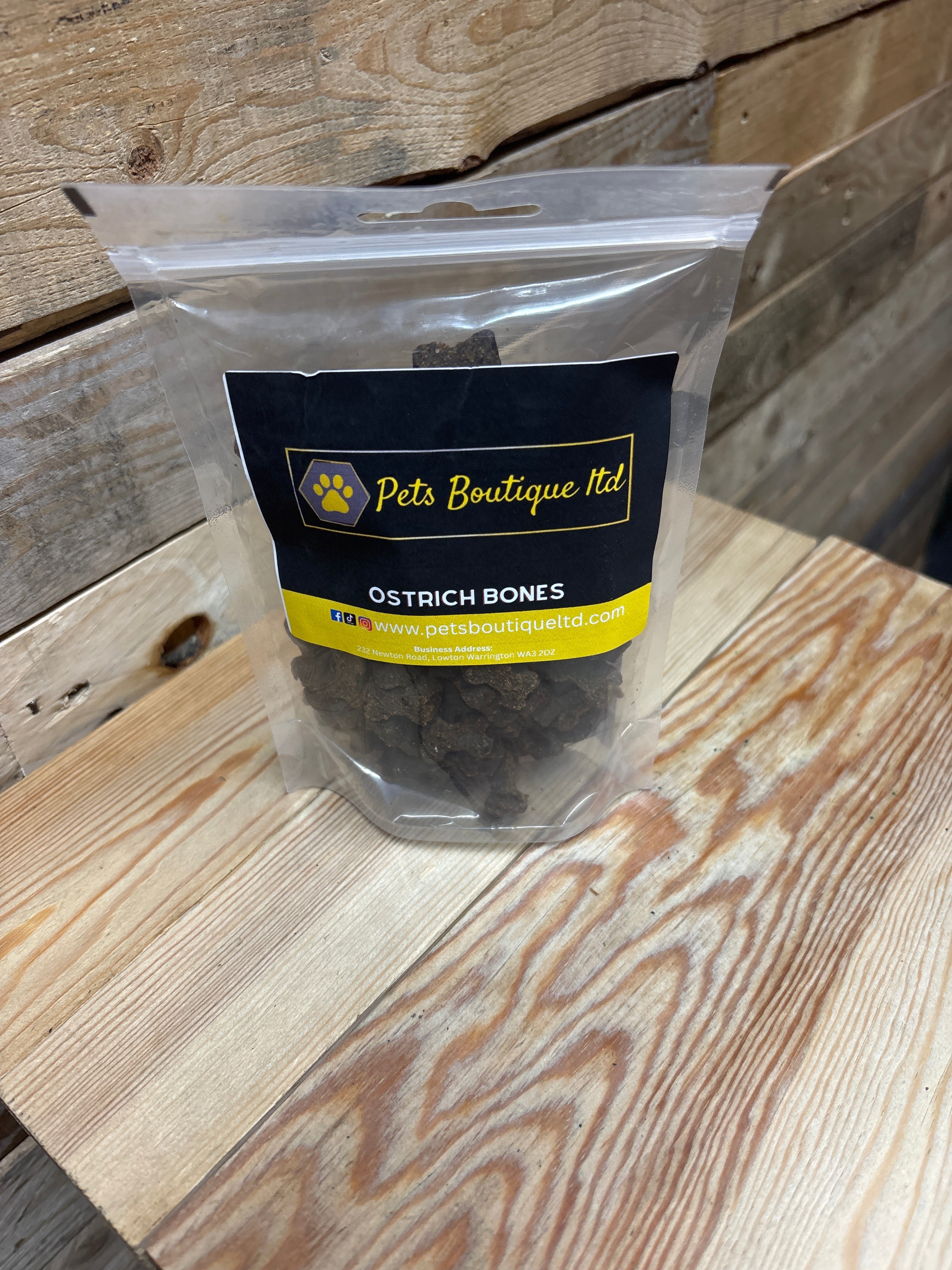 Pets Boutique natural ostrich bone treats contain 100% Ostrich meats all gently steamed and compressed into mini bone shaped rewards which are not only tasty, but perfect for training and sharing too. Comes in a 160g resealable pouch
